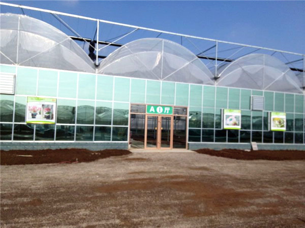 采用熱鍍鋅鋼制骨架,覆蓋材料為5mm鋼化玻璃,透光率在九十以上。溫室大棚頂部及四周為專用鋁型材。溫室大棚頂部為雙向開窗,齒輪齒條副傳動。根據用戶需要,溫室大棚兩個端面可安裝濕簾和風機,也可在兩個端面及側面安裝鋁型材推拉窗、平開窗或外翻窗。